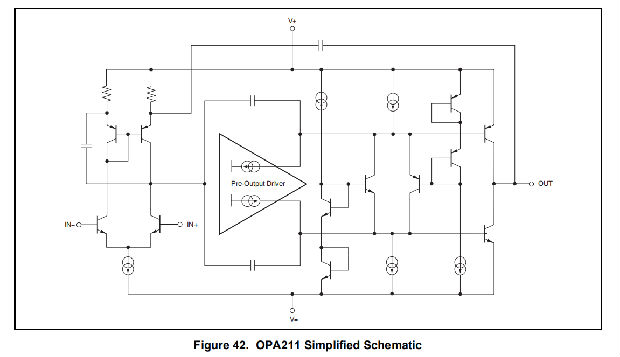 OPA211是一个单位增益稳定,精度非常低的运算放大器。噪声或高阻抗电源的应用要求去耦电容器靠近器件引脚。在大多数情况下,0.1-μF电容器就足够了。图42显示了OPA211的简化示意图。该芯片采用SiGe双极工艺,包含180个晶体管。