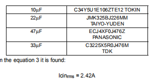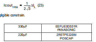 动态规格有时比静态要求更宽松,无论如何,必须确保最小输出电容,以避免在负载瞬态过程中因充电和放电而引起的输出电压变化。为了使装置控制回路正常工作,输出电容器ESR(τ=ESR)引入零点·Cout)必须至少比开关频率小十倍。低ESR钽电容器零度接近10千赫,适合输出滤波。输出电容值COUT及其ESR,ESRCOUT,应分别足够大和足够小,以保持输出电压在精度范围内一个负载瞬态,并给设备一个最小的信噪比。电流纹波流经输出电容器,因此也应计算出以维持该纹波:均方根电流值由式18给出。
