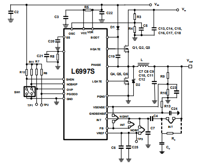 一个肖特基二极管可以增加在高开关频率下的系统效率(其中死区时间可能是整个切换周期的一个重要部分)。此可选二极管必须并联放置,同步整流器必须有反向电压VRRM比VINMAX大。必须选择二极管的电流大小,以使其处于安全工作状态。为了使用比可能少的空间,在一个封装中选择了一个双MOSFET:STS5DNF20V
