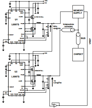 双数据速率(DDR)存储器需要特定的电源管理架构。这是因为驱动芯片组和存储器输入之间的跟踪必须用电阻器终止。因为芯片组驱动存储器有一个推挽输出缓冲器,终端电压必须能够产生和吸收电流。此外,终端电压必须等于存储器电源(输入端)的一半记忆是一个差分阶段,需要一个参考偏差的中点)和跟踪它。对于DDRI内存电源为2.5V,终端电压为1.25V,而DDRII的存储电源为1.8V,终端电压为0.9V。图27显示了使用2 x L6997S。1.8V部分为内存供电,0.9V部分提供终端电压。