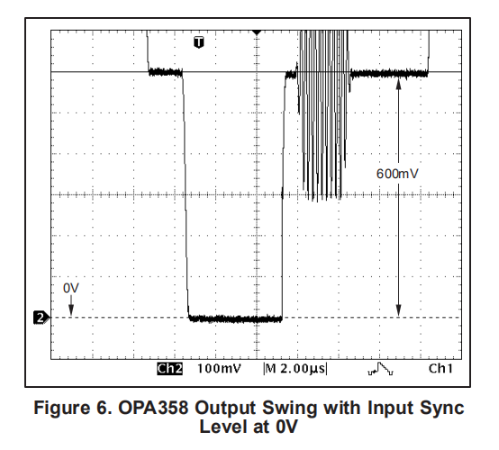 图6显示了OPA358的输出摆动能力,它通过驱动输入,同步电平为0V。OPA358的输出非常接近0V,通常在小于5mV的范围内摆动,负载接地为150Ω。
