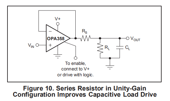 改进单位增益配置中电容性负载驱动的一种方法是在输出端串联一个10Ω到20Ω的电阻器,如图10所示。这大大减少了大电容负载时的响铃。然而,如果有一个电阻负载与电容负载并联,RS会产生一个分压器。这会在输出端引入直流误差,并略微减小输出摆幅。这个错误可能无关紧要。例如,在RL=10kΩ和RS=20Ω的情况下,输出只有大约0.2%的误差。