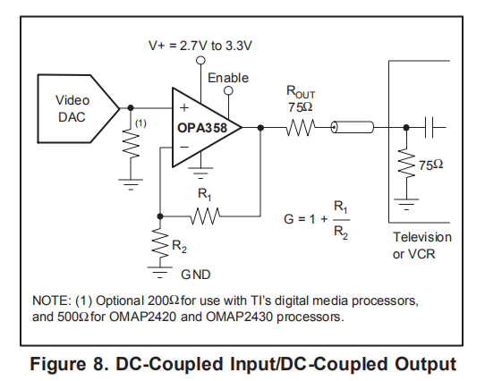 由于出色的摇摆到地面,OPA358也可以直流耦合到视频负载。如图8所示,这样就不需要在输出端使用交流耦合电容器。这在主板空间受限的便携式视频应用中尤为重要。