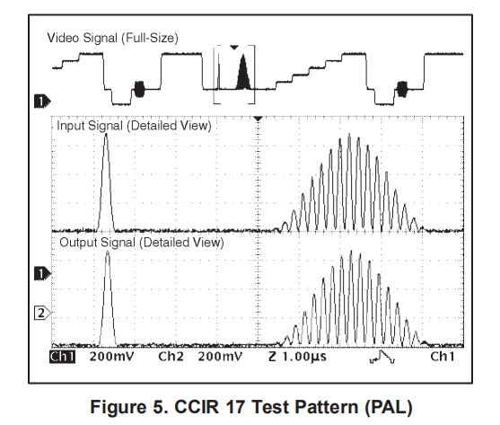 色度与亮度增益不相等(或相对色度电平)是视频信号的色度和亮度分量在不同频率下增益比的变化。常见的测试模式是测试模式ccir17中的脉冲,如图5所示。如图3和图4所示,顶部波形显示了完整的测试模式。中间和底部波形是完整波形关键部分的更详细视图,中间波形表示来自视频发生器的输入信号,底部波形是输出到线路的OPA358。