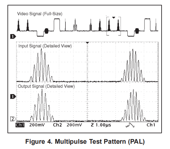 频率响应测量评估视频系统在不影响各自振幅的情况下均匀传输不同频率信号分量的能力。图3显示了多脉冲测试模式;图4显示了多脉冲。这些图中的顶部波形显示了完整的测试模式。中间和底部波形是完整波形的关键部分的更详细视图。中间的波形代表来自视频发生器的输入信号;底部的波形是输出到线路的OPA358。