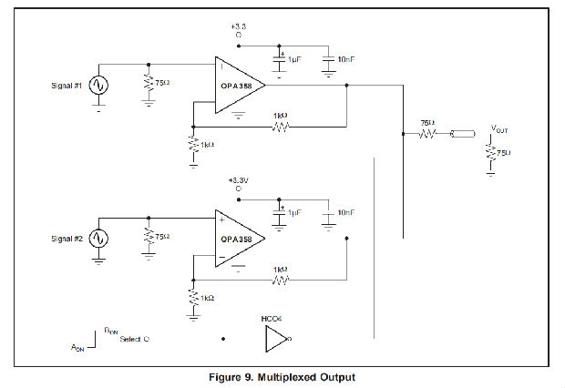 视频放大器(包括使能管脚)的一个常见应用是将多个放大器输出连接在一起,然后从几个可能的视频输入中选择哪一个输入到一条线路上。这个简单的有线或视频多路复用器可以使用OPA358轻松实现,如图9所示。