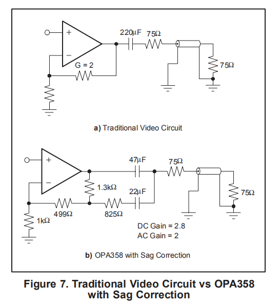 直流耦合输出配置也显示出最佳的视频性能。没有线或场倾斜允许使用最低的电源。在这种模式下,OPA358将安全地工作到2.5V,而不切断信号。