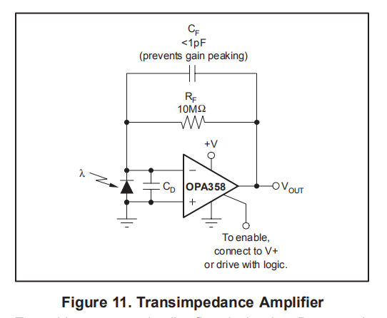 对于更高的跨阻带宽,可以使用CMOS OPA380(90mhzgbw)、OPA355(200mhzgbw)或OPA655(400mhzgbw)。