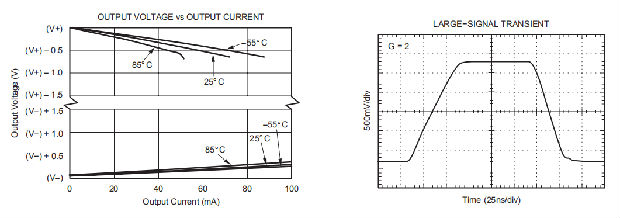 AB类输出级采用共源晶体管实现轨对轨输出。对于150Ω负载,当负载连接到VS/2时,输出电压摆幅从负轨到正轨分别为100mV和200mV。对于较轻的负载,在保持高开环增益的同时,输出极为靠近电源轨。如果负载接地,OPA358输出通常在离地5mV范围内摆动。见典型特性曲线,输出电压摆幅与输出电流。
