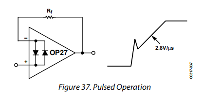 当Rf≤100Ω且输入由快速、大信号脉冲(>1V)驱动时,输出波形如脉冲运行图所示(见图37)。