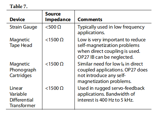 表7列出了一些信号源的典型源电阻,供参考。