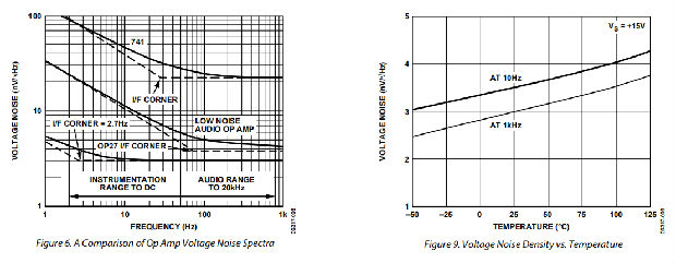 当RS<1 kΩ时,OP27的低压噪声保持不变。当RS<1kΩ时,总噪声增大,但主要由电阻噪声而不是电流或电压噪声控制。只有当RS超过20KΩ时,电流噪声才开始占主导地位。可以这样说,电流噪声对于低至中等源电阻的应用并不重要。OP27和OP07噪声之间的交叉出现在15kΩ到40kΩ区域。