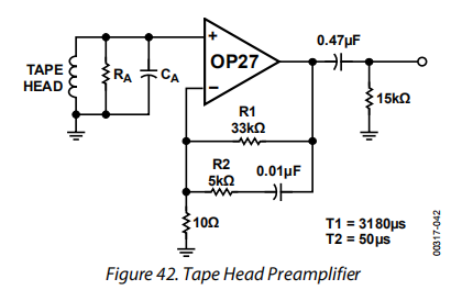 用于NAB磁带播放的前置放大器类似于RIAA声纳前置放大器,不过通常需要更多的增益,而均衡则需要大量的低频增强。如图42所示,图41中的电路可以很容易地修改以供磁带使用。