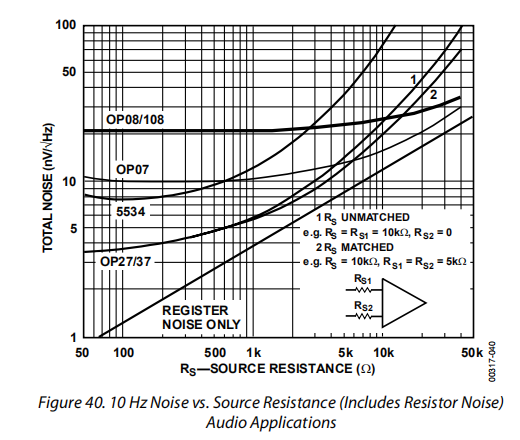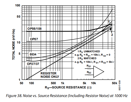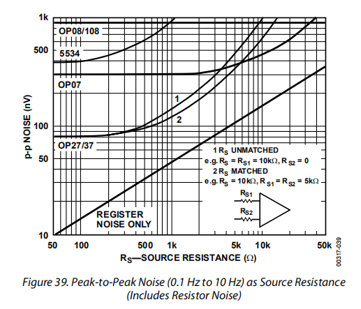 图38显示了1000赫兹时噪声与源电阻的关系。同样的图也适用于宽带噪声。要使用此图,请将垂直比例乘以带宽的平方根。