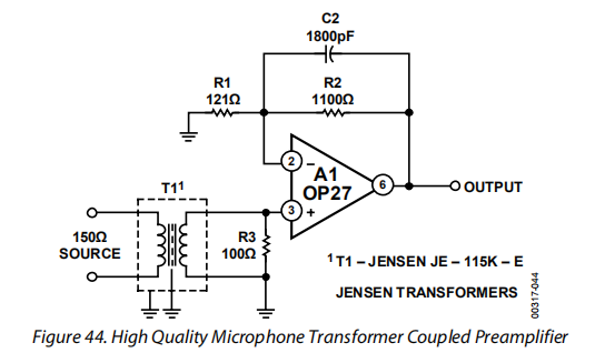 对于要求相当低噪声的应用,高质量麦克风变压器耦合前置放大器(图44)包含内部补偿的OP27。T1是一个JE115K-E150Ω/15KΩ变压器,为OP27装置提供最佳的源电阻。该电路的总增益为40dB,是变压器电压设置和运算放大器电压增益的乘积。