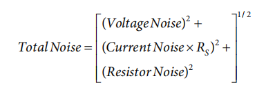 电压噪声与偏置电流的平方根成反比,而电流噪声与偏置电流的平方根成正比。使用高源电阻时,OP27的噪声优势消失。图38、图39、图40将观察到的OP27总噪声与不同电路应用中其他器件的噪声性能进行比较。