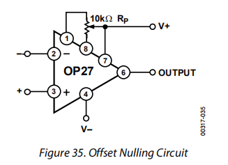 OP27系列装置可直接插入OP07插座,无论是否移除外部补偿或调零组件。此外,OP27可安装在未拔插的AD741型插座上;但是,如果使用传统的AD741调零电路,则应修改或拆除它,以确保OP27正确工作。OP27偏移电压可以使用电位计调零为0(或另一个需要的设置)(见图35)。