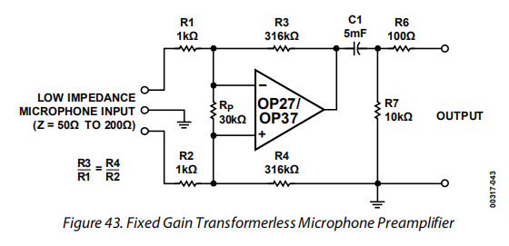 一个简单但有效的固定增益无变压器麦克风前置放大器(图43)将来自低阻抗麦克风的差分信号放大50dB,输入阻抗为2kΩ。由于电路的高工作增益,OP37有助于保持110 kHz的带宽。由于OP37是一个失补偿设备(最小稳定增益为5),因此如果要拔出麦克风,可能需要一个假电阻Rp。否则,来自开放输入的100%反馈会导致放大器振荡。