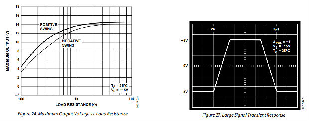 OP27提供稳定的运行,负载电容高达2000 pF和±10 V摆动;较大的电容应与反馈回路内的50Ω电阻器解耦。OP27是统一增益稳定。