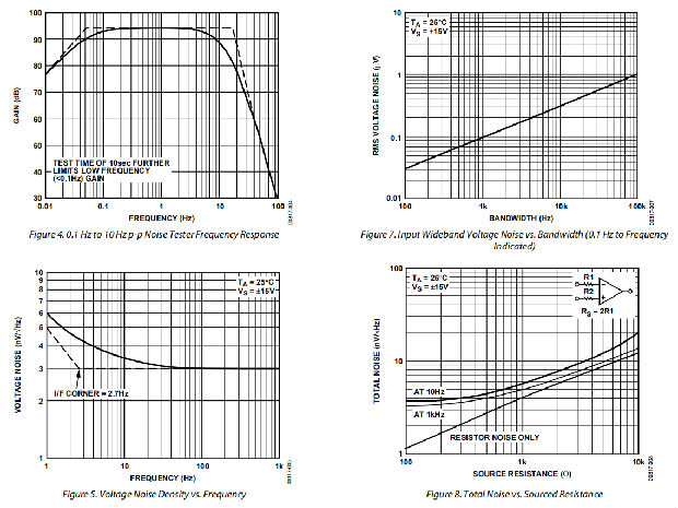 •当测量大量装置上的噪声时,建议进行噪声电压密度试验。10 Hz噪声电压密度测量值与0.1 Hz至10 Hz p-p噪声读数有很好的相关性,因为这两个结果都是由白噪声和1/f转角频率的位置决定的。