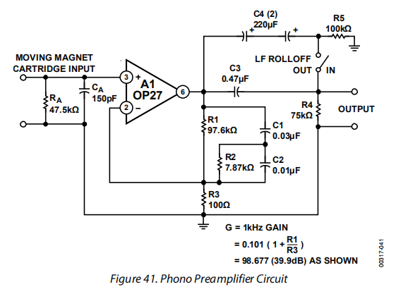 图41是使用用于A1的OP27的语音前置放大器电路的示例;R1-R2-C1-C2用标准元件值构成了一个非常精确的RIAA网络。实现RIAA语音均衡的常用方法是在高质量增益块周围采用频率相关反馈。选择适当的RC网络可以提供3180μs、318μs和75μs三个必要的时间常数。