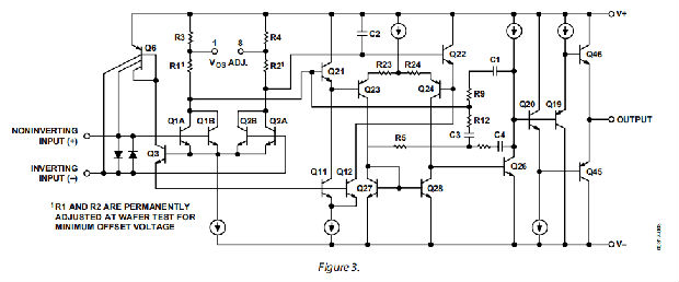 OP27是一种非常低噪声的单片运算放大器。OP27的输入电压噪声特性主要是通过在高静态电流下操作输入级来实现的。通常会增加的输入偏置电流和偏置电流由输入偏置电流消除电路。OP27A/E在25°C时的IB和IOS分别为±40 nA和35 nA。当输入具有高源电阻时,这一点尤为重要。此外,许多音频放大器设计师更喜欢使用直接耦合。以前设计的高IB、VOS和TCVOS使得直接耦合很难使用,如果不是不可能的话。