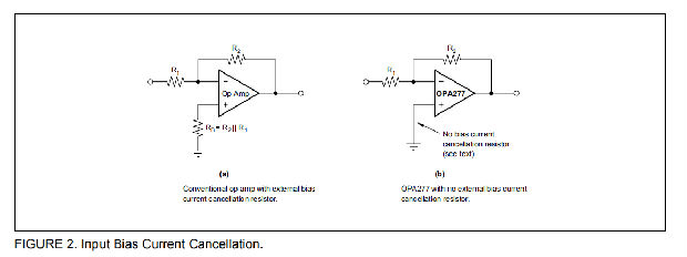 当以这种方式消除偏置电流时,输入偏置电流和输入偏置电流的幅值大致相同。因此,不必像其他运算放大器那样使用偏置电流消除电阻器(图2)。为了消除输入偏置电流误差而增加的电阻实际上可能会增加偏置电压和噪声。