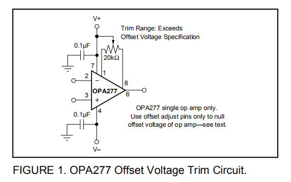 OPA277系列是激光微调的非常低的偏移电压和漂移,因此大多数电路将不需要外部调整。然而,偏置电压微调连接在引脚1和8上。如图1所示,可以通过连接电位计来调整偏移电压。此调整只能用于使运算放大器的偏移为零。这种调整不应用于补偿系统中其他地方产生的偏移,因为这可能会导致额外的温度漂移。