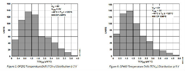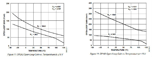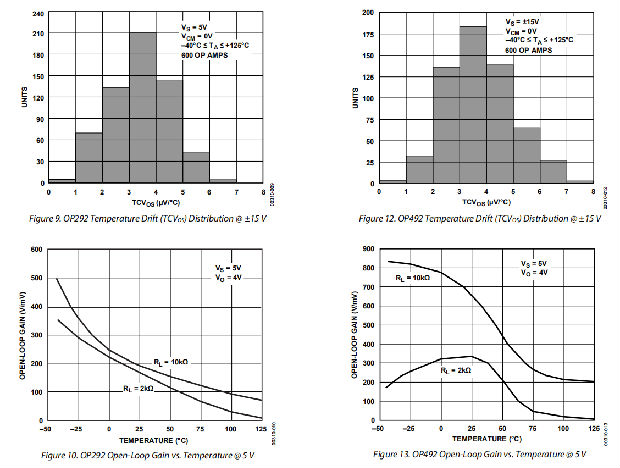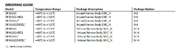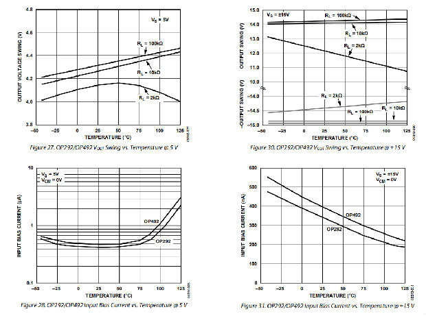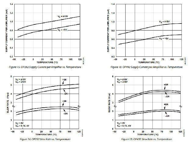 OP292/OP492系列性能适用于扩展工业温度范围(−40°C至+125°C)的单电源或双电源电压运行。