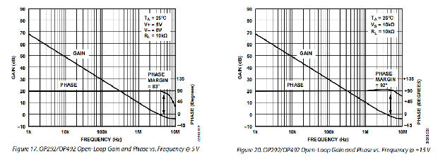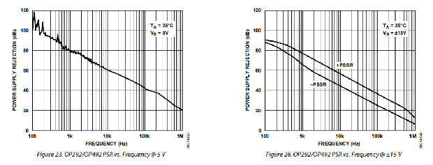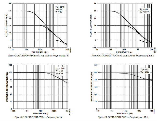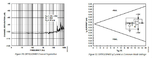 OP292/OP492设计为在单电源+5 V或±15 V时工作正常。建议的最低电源电压为4.5 V。