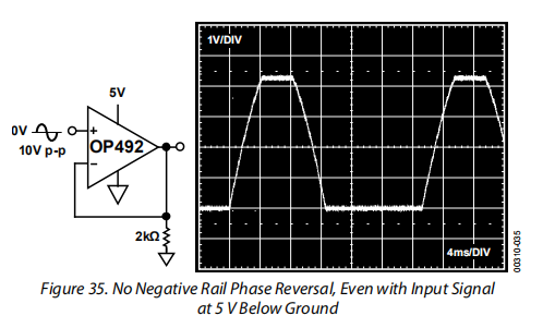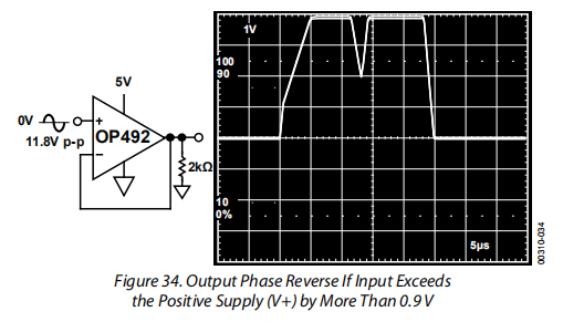 OP492有内置的保护,当输入电压进入任一供电轨时,可防止相位反转。事实上,它是安全的输入超过任何一个供电轨高达0.6伏没有风险的相位逆转。但是,输入不应超出正电源轨超过0.9 V;否则,输出将反相。如果出现这种情况,可以通过在输入引脚上串联一个5kΩ的限流电阻器来解决问题。有了这个附加值,输入可以在没有相位反转的情况下达到超过5 V的正轨。