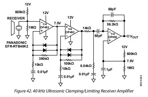 图42显示了一个超声波接收放大器,它使用低成本二极管的非线性阻抗来有效地控制宽动态范围的增益。该电路通过一对低成本的钳位放大器放大40khz的超声信号,然后送入带通滤波器以提取干净的40khz信号进行处理。