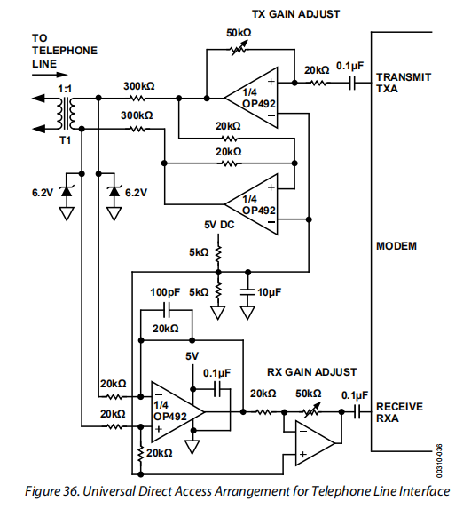 图36显示了调制解调器电路的5V单电源发送/接收电话线接口。它允许在变压器耦合的600V线路上以差分方式进行调制解调器信号的全双工传输。传输部分增益可以为特定的调制解调器设备输出设置。类似地,可以基于调制解调器设备输入要求适当地选择接收放大器增益。该电路在一个5伏电源上工作。标准值电阻器允许使用SIP封装的电阻阵列;与单个封装中的四个运算放大器相结合,这提供了一个紧凑、低部件计数的解决方案。