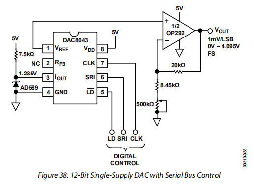 OP292/OP492是缓冲单电源dac输出的理想选择。图38显示了一个典型的放大器,用于缓冲连接用于单电源操作的CMOS DAC的输出。为此,正常电流输出的12位CMOS DAC(R-2R梯形图)向后连接以产生电压输出。这种操作配置需要一个低电压基准。在这种情况下,使用1.235V低功率基准。相对较高的输出阻抗(10kΩ)被OP292缓冲,同时,获得了更高的可用水平。电位计为4.095 V满标度提供精确的增益微调,允许每LSB控制分辨率增加1 mV。