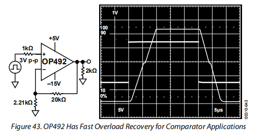 OP292/OP492具有优良的过载恢复特性,适合于精密比较器的应用。图43显示了OP492的饱和恢复特性。放大器的传播延迟很小。放大器将信号精确地与<0.5 mV偏移误差进行比较。