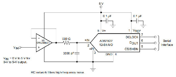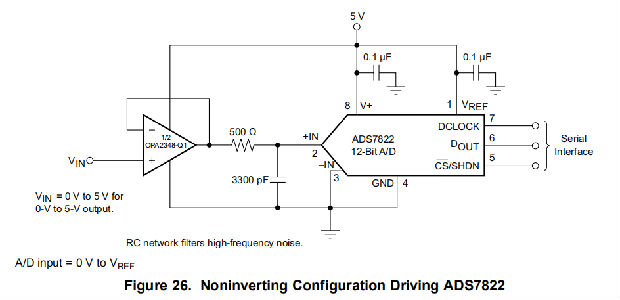 图26显示了在驱动ADS7822设备的基本非转换配置中的OPA2348。ADS7822设备是MSOP-8封装中的12位微功耗采样转换器。当与OPAx348-Q1系列器件的低功耗微型封装一起使用时,这种组合是空间有限、低功耗应用的理想选择。在这种配置中,ADC输入端的RC网络可用于提供抗混叠滤波和电荷注入电流。