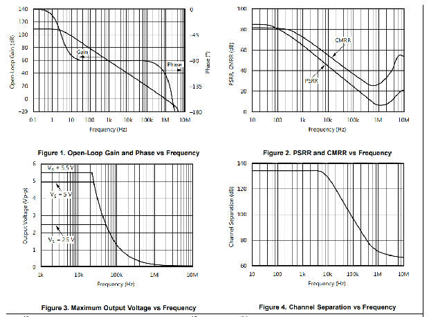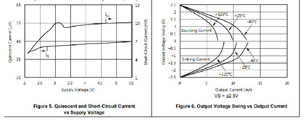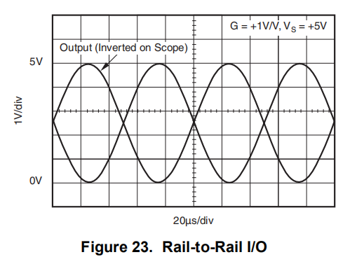 OPAx348-Q1设备具有宽带宽和单位增益稳定性,具有轨对轨输入和输出,以增加动态范围。图23显示了unitygain配置的OPAx348-Q1设备的输入和输出波形。操作由单个5 V电源供电,100-kΩ负载连接至VS/2。输入为5-VPP正弦波。输出电压约为4.98 VPP。