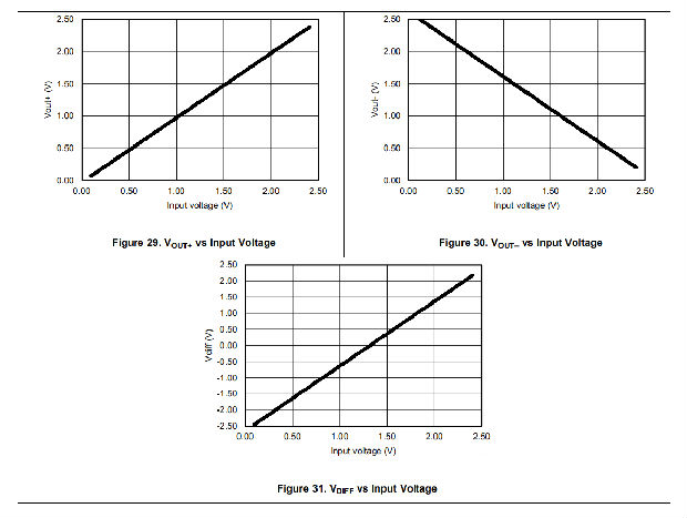 有些应用需要差分信号。图28显示了一个简单的电路,将0.1 V至2.4 V的单端输入转换为单个2.7 V电源上的±2.3 V差分输出。有意限制输出范围以使线性度最大化。电路由两个放大器组成。一个放大器起缓冲作用,产生电压VOUT+。第二个放大器反转输入,并添加一个参考电压来生成VOUT–。VOUT+和VOUT–范围从0.1 V到2.4 V。差值VDIFF是VOUT+和VOUT–之间的差值。这种配置使得差分输出电压范围为2.3V。
