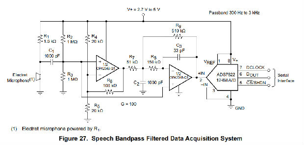OPAx348-Q1系列设备还可用于非转换配置,以在有限的低功耗应用中驱动ADS7822设备。在这种配置中,ADC输入端的RC网络可用于提供抗混叠滤波和电荷注入电流。在语音带通滤波数据采集系统中驱动ADS7822设备的OPAx348-Q1见图26。这种小型、低成本的解决方案提供了必要的放大和信号调节,以便直接与驻极体麦克风接口。该电路在VS=2.7 V至5 V的条件下工作,典型静态电流小于250μA。