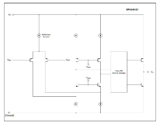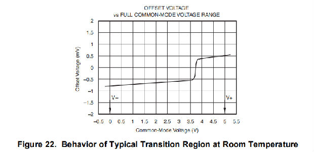 将opax3200mv的输入电压范围扩展到了opax3200系列的输入电压范围之外。这种性能是通过一个互补的输入级实现的:一个N信道输入差分对与一个P信道差分对并行。N通道对在正极轨道附近的输入电压有效,通常为正极电源上方(V+)-1.3 V至200 mV。对于从负电源以下200 mV到大约(V+)-1.3 V的输入,P通道对处于开启状态。存在一个小的过渡区域,通常为(V+)-1.4 V至(V+)-1.2 V,其中两个对都打开。这个200毫伏的过渡区可以随着工艺的变化而变化到300毫伏。因此,在低端,过渡区(两个阶段都开启)的范围为(V+)-1.7 V至(V+)-1.5 V,高端可达(V+)-1.1 V至(V+)-0.9 V。在该过渡区域内,与该区域外的器件操作相比,PSRR、CMRR、偏移电压、偏移漂移和THD可能降低。