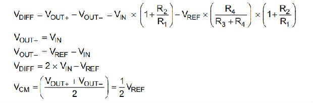 差分输出信号VDIFF是两个单端输出信号VOUT+和VOUT-。方程3显示了VDIFF的传递函数。通过应用R1=R2和R3=R4的条件,将传递函数简化为方程6。使用这种配置,最大输入信号等于参考电压,每个放大器的最大输出等于VREF。差分输出范围为2×VREF。此外,共模电压(VCM)是VREF的一半(见方程式7)。