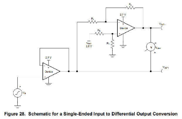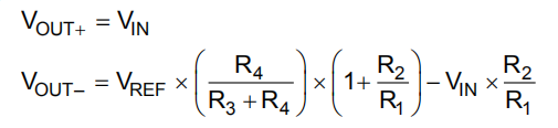 图28中的电路接收单端输入信号VIN,并生成两个输出信号VOUT+和VOUT–使用两个放大器和一个参考电压VREF。VOUT+是第一个放大器的输出,是输入信号VIN的缓冲版本(如等式1所示)。VOUT–是第二个放大器的输出,它使用VREF向VIN添加偏移电压,并通过反馈添加反向增益。VOUT–的传递函数在方程式2中给出。