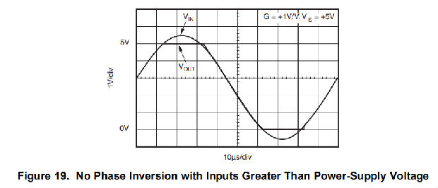 输入共模范围从(V-)–0.2 V扩展到(V+)+0.2 V。对于正常操作,输入应限制在该范围内。绝对最大输入电压超过电源500毫伏。大于输入共模范围但小于最大输入电压的输入虽然无效,但不会对运算放大器造成任何损坏。与其他运算放大器不同,如果输入电流受到限制,输入可能会超出电源而不发生相位反转,如图19所示。