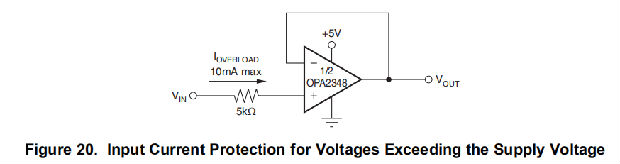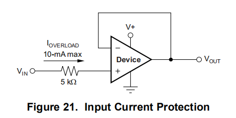 正常情况下,输入电流为0.5 pA。但是,大输入(超过电源轨500 mV)会导致过多电流流入或流出输入引脚。因此,将输入电流限制在10毫安以下以及保持输入电压低于最大额定值是很重要的。如图20所示,输入电阻很容易实现。