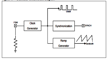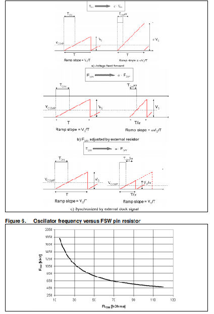 该装置可以同步工作,以更高的频率馈送外部时钟信号。同步改变锯齿波振幅,改变脉宽调制增益(图5.c)。在研究环路稳定性时,必须考虑这种变化。为了使PWM增益的变化最小,应设置自由运行频率(使用FSW引脚上的电阻)仅略低于外部时钟频率。这个预调整频率的变化会改变锯齿斜率,以获得可忽略的截断锯齿,由于外部同步。