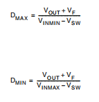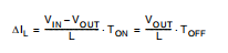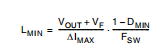 式中,TON和TOFF是内部电源开关的打开和关闭时间。最大值在固定电压下,电流纹波是在最小占空比下的最大TOFF获得的(参见上一节计算最低负荷)。因此,确定∆IL=最大值的20%至40%输出电流,最小电感值可计算: