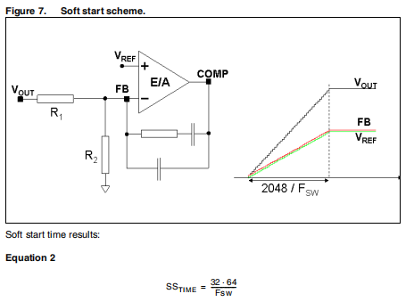 软启动是保证降压变流器正确、安全启动的关键。它避免了励磁涌流冲击,使输出电压单次上升。软启动是由一个阶梯斜坡在非反转输入(VREF)上执行的误差放大器。所以输出电压转换率为: