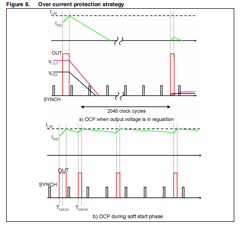 1.输出电压调节。当检测到过电流时,功率MOSFET关闭和内部参考(VREF),这将使误差放大器设置为零,并在软启动时间(TSS,2048)内保持此状态时钟周期)。在这段时间之后,一个新的软启动阶段发生,内部引用开始倾斜(参见图8.a)。