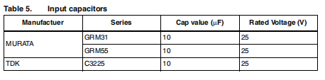 其中,VF是续流二极管上的正向电压,VSW是通过的电压降内部PDMOS。表5中报告了一些适用于该装置的多层陶瓷电容器: