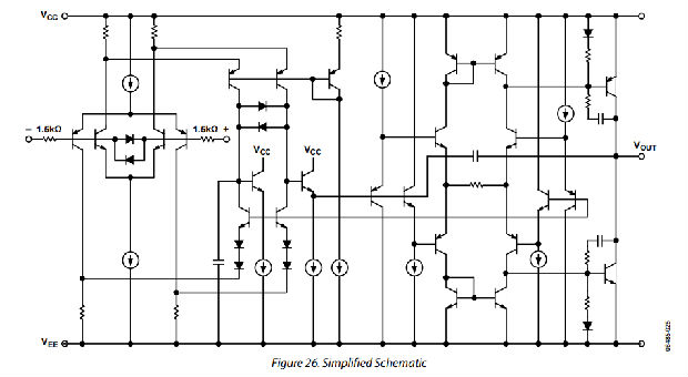 图26显示了AD8614/AD8644的简化示意图。输入级为轨对轨,由两个互补差分对、一个NPN对和一个PNP对组成。输入级由两个背越式二极管防止雪崩击穿。每个输入端都有一个1.5 kΩ的电阻器,在过电压事件期间限制输入电流,并在超过输入值时提供相反转保护。两个差分对连接到一个双折叠共源共栅。这是放大器中增益最大的阶段。双折叠式共源共栅对输出级电路进行差分馈电。两个互补的共发射极晶体管被用作输出级。这使得输出在10毫安的负载下从每根导轨摆动到125毫伏以内。输出级的增益和运算放大器的开环增益取决于负载电阻。